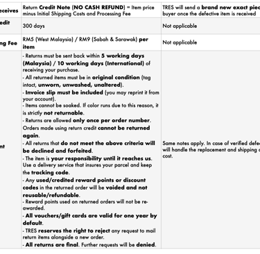 Returns that do not meet all the above conditions will be strictly declined and forfeited.